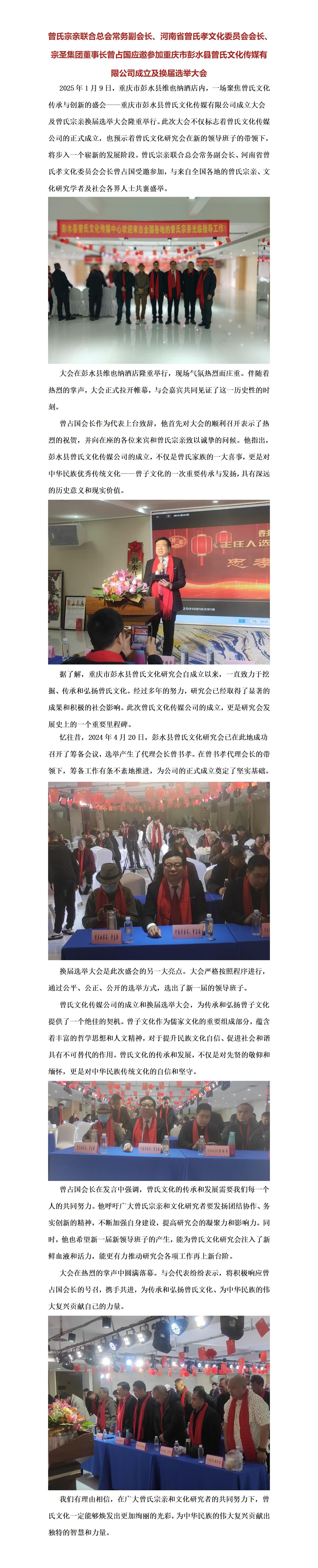 曾氏宗親聯合總會常務副會長、河南省曾氏孝文化委員會會長、宗圣集團董事長曾占國應邀參加重慶市彭水縣曾氏文化傳媒有限公司成立及換屆選舉大會